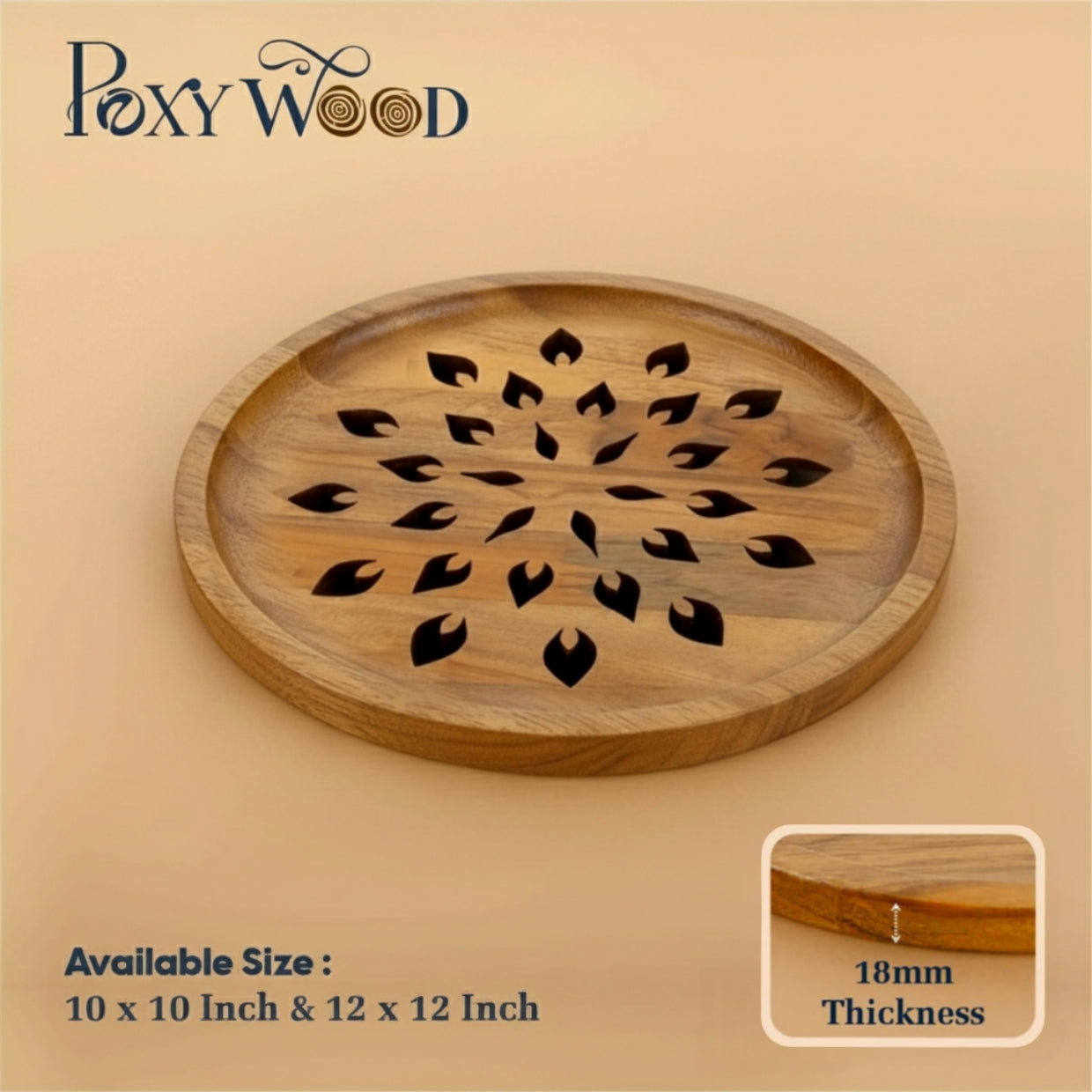 The most special feature of this Round Wooden Tray is its 18 mm thick slotted base, which lets out the steam from the roti and keeps it soft and warm for a long time. The attached buffer feet give stability to the Round Wooden Plate and keep the airflow smooth from underneath, making it work great as a Round Teak Wooden Bhakri Plate as well.