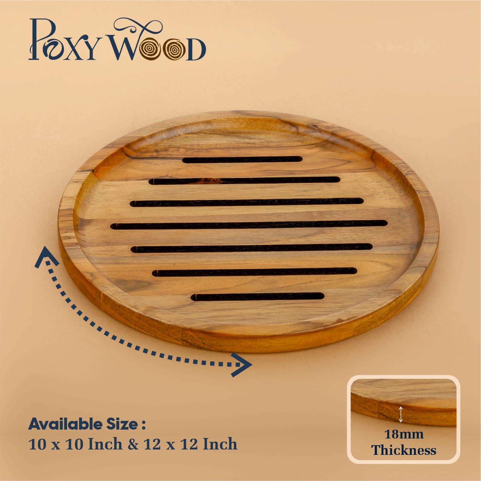 The most special feature of this Round Wooden Tray is its 18 mm thick slotted base, which lets out the steam from the roti and keeps it soft and warm for a long time. The attached buffer feet give stability to the Round Wooden Plate and keep the airflow smooth from underneath, making it work great as a Round Teak Wooden Bhakri Plate as well.